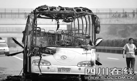 昨日上午,剛參加完全國中學生田徑錦標賽的山東隊34名學生,乘坐一輛大巴車,從南充返程準備去雙流機場登機,在途經成都繞城高速路22公里處,大巴車突然冒出漆黑的濃煙,短短兩分鐘內,火苗躥出車頂兩三米高,汽車燒成了光架架。護送學生參賽的教練以及沿線路政人員冒險救援。除了剛剛獲得的部分獎牌、證書在大火中被毀外,34名學生有驚無險。