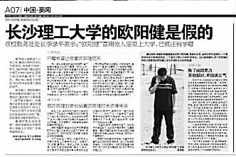 在長沙理工大學讀大三的“歐陽健”,在接受湖南媒體采訪時,也稱自己的成績和身份不假。26日,湖南某報推出跟蹤報道《長沙理工大學的歐陽健是假的》。報道稱,長沙理工大學教務處表示那里的“歐陽健”,冒用他人信息上大學,已被取消學籍。