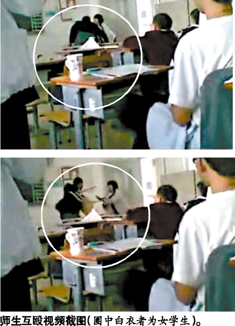 然而,該女生毫不示弱,拿起凳子扔向老師。打斗場面并未結(jié)束,老師再從一邊撿起該女生砸來的板凳回敬了該女生,兩人一直廝打到教室門口處,直到一教師模樣的人從門外沖進教室,雙方才結(jié)束“戰(zhàn)斗”。