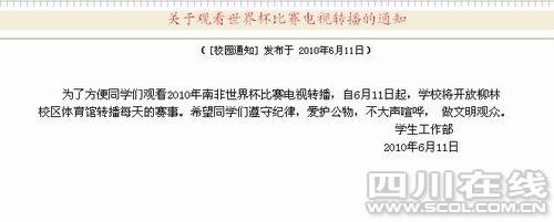 西財在校學生小徐在本報大成網新聞報料臺轉發了這則通知:“2010年南非世界杯開幕在即,世界杯比賽期間正值國家英語四六級考試和期末復習考試階段,為了維護學校的正常教學和生活秩序,確保同學們能夠正常的休息,以良好的狀態溫課迎考,應廣大同學和學生家長的要求,學校決定自6月11日起至賽事結束,學生公寓熄燈以后校園網絡也將暫停使用。”