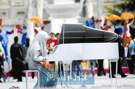 一陣風(fēng)起,銀色的長(zhǎng)假發(fā)隨風(fēng)舞動(dòng),銀色的衣袂也被風(fēng)掀起。與衣服、頭發(fā)、鋼琴相映襯的,是她涂滿了銀色顏料的臉龐。看著這張沒(méi)有任何表情的臉龐,你很難想象這是一個(gè)真人。