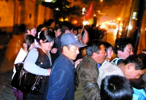 昨晚7時許,解放軍307醫院門口,數十名家長和孩子相互配對,排成四列,正在等候大巴車。