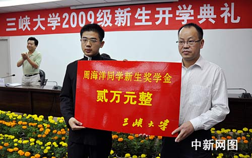 開(kāi)學(xué)典禮上,三峽大學(xué)校長(zhǎng)李建林為5名新生頒發(fā)錄取通知書(shū),三峽大學(xué)黨委副書(shū)記何偉軍為周海洋頒發(fā)了2萬(wàn)元新生獎(jiǎng)學(xué)金。隨后,周海洋作為新生代表發(fā)言,他說(shuō),自己是懷著感恩的心態(tài)進(jìn)入三峽大學(xué)的,站在新的人生起點(diǎn),他最大的希望是4年內(nèi)學(xué)有所成,以此報(bào)答學(xué)校的培養(yǎng)和家人的厚望。周海洋的發(fā)言不似他的文章那般酣暢淋漓,而是顯得有點(diǎn)語(yǔ)無(wú)倫次,他多次表示是由于太激動(dòng)的緣故。