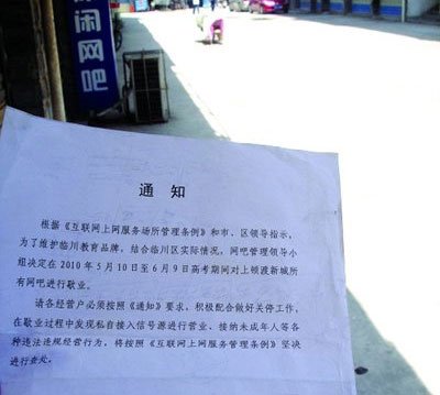 5月30日,有網友在天涯社區發帖稱,5月25日山西臨縣網吧協會貼出了網吧關閉的公告:“有關部門要求網吧停業,具體何時開放另行通知。”該網友稱據傳是因為即將到來的高考而強制關閉了該縣城所有網吧,“全縣所有的網吧都在劫難逃,光纜被停,只能用電話線上網。”