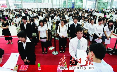 當(dāng)日,深圳大學(xué)2009屆法學(xué)專業(yè)學(xué)生小楊早上7時30分就和同學(xué)坐車趕到了會展中心,本以為能“趕個早集”,哪知道會展中心門口早已排滿了幾萬名從全國各地趕來的畢業(yè)生。等到8時30分會展中心提早開門時,弱小的小楊花了很大的力氣才“好不容易”被“推”進(jìn)了會場。然后,她花了近2個小時把整個會場轉(zhuǎn)了一遍,雖物色到了符合自己要求的企業(yè),但是因?yàn)槿颂?她沒有投出一份簡歷。