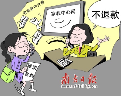 “家教中介費怎么就易收難退?”日前,本報接到華南師范大學學生小東(化名)報料稱,在其交納中介費后由于受教對象原因未能成功進行家教,但家教中介公司卻以有關條款為由不予退款。