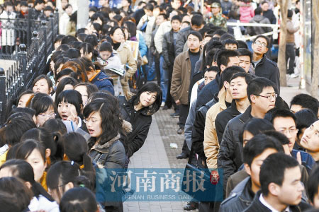 上午7時30分,河南人才市場的大門還沒有開,求職心切的人們已在大門外排起了長隊。很快,一男一女兩行隊伍排了足足500米長。
