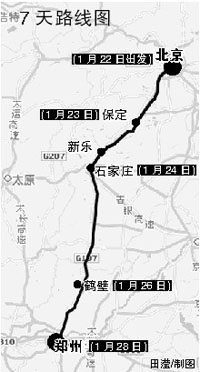 第二天他從保定出發時,路上已經結滿了冰,給前行帶來了困難。“我總結出一些經驗,比如只能堅持前進,不能長時間休息,否則就會泄氣。中途體力不支的時候可以停下來吃點巧克力補充,但時間也不能太長。”就這樣,高富松一路向南,23號留宿新樂,24號留宿石家莊,一步步向目標靠近。