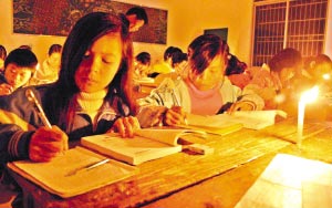 昨天(19日)下午6時40分,16歲的陳麗娟與同學們照例走入課室,從老師手中接過一支蠟燭點燃,當晚,連州市西江鎮中學600多學生在點點燭光中,迎來了2008年新學期的第一個晚自修。