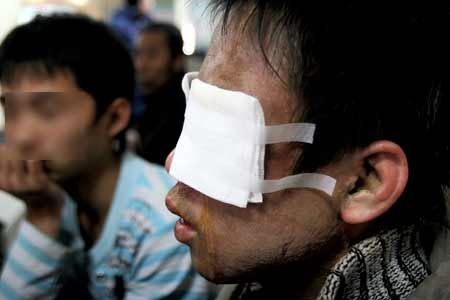 中日聯誼醫院的值班醫生說,傷者臉部、脖頸等多處被燒傷,臉部已經被毀容,眼睛已經看不清任何物體,因為沒有錢,目前只做了常規的檢查,從被傷害的程度看,如果不能及時治療,隨時有失明可能。聽到這個消息,時東旭的情緒有些激動,“我才18啊,我不想瞎啊!”雖然眼睛被紗布蒙住,卻沒有擋住時東旭的淚水。