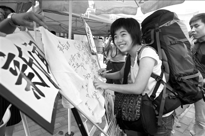 在蔣方舟為自己準備的上學(xué)裝備中,一整套自己寫的書成了必備品!耙苍S以后接受采訪時要用,以防不備吧!北M管一再說自己對新生活誠惶誠恐,但她顯然要比更多同齡人見過大世面。在新聞系為新生準備的T恤上簽名時,蔣方舟也完全沒有像其他新生那樣羞澀。