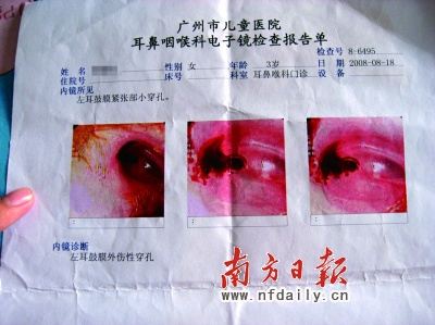 8月18日,何女士帶著耳痛未減的小賢復診,經過電子鏡檢查,診斷為左耳鼓膜外傷性穿孔!袄锩嬉呀浧屏艘粋口,孔里和四周充滿紅色的血漿。醫生說聽力降低了20-30分貝。”何女士指著化驗單,一臉憂心忡忡。
