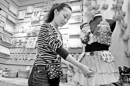 “安全套有招財(cái)保平安的作用。”營(yíng)業(yè)員胡小姐稱,這些安全套飾品價(jià)格從十幾元到幾十元不等,開(kāi)業(yè)初,顧客以為是情趣店,不敢進(jìn)來(lái),后來(lái)掛出飾品的招牌才使得顧客慢慢接受,經(jīng)常來(lái)光顧的大部分是90后。她還稱,全國(guó)很多城市都有安全套首飾店,生意很火爆。昨日(10月23日),記者通過(guò)電話聯(lián)系到首飾店老板,對(duì)方稱,制作飾品的安全套全部都是中國(guó)臺(tái)灣和日本生產(chǎn)的。