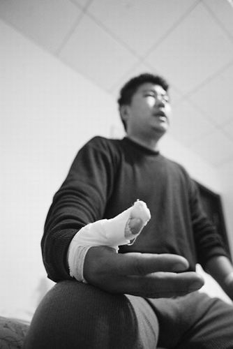 昨日(10月28日),記者在農(nóng)安縣醫(yī)院見到了崔老師,他眼眶青紫,臉腫著,已經(jīng)骨折的右手拇指纏著繃帶。據(jù)崔老師回憶,10月27日17時(shí)10分許,他接到班上女同學(xué)電話,說有一群20左右歲的男青年來班上找人,這些人酒氣熏天,有的提著棒子,有的還拿著刀,氣勢洶洶地點(diǎn)名要找班上一名姓馬的同學(xué)算賬。崔老師接到電話立即跑向教室。此時(shí),距上晚自習(xí)還有近20分鐘,教室里有10多名同學(xué),其中有兩名男生。