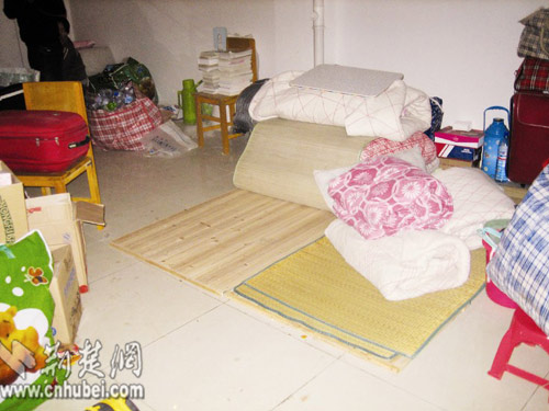 記者程翔報(bào)道:昨晚,湖北經(jīng)濟(jì)學(xué)院眾多學(xué)生因無床可睡,只好打地鋪度過漫漫寒夜!澳憧,這就是我們的寢室,床都被拆走了!弊蛲7時(shí)30分許,一名女學(xué)生指著一片狼藉的宿舍對記者如是說(如上圖)。據(jù)她介紹,宿舍住的是該校會(huì)計(jì)學(xué)院自考班大二的學(xué)生。大一的時(shí)候,她們住在東湖邊的濱湖校區(qū)。今年9月,學(xué)校下發(fā)通知,稱已在該校大門對面商業(yè)街旁修好了幾棟宿舍,讓她們搬過去。