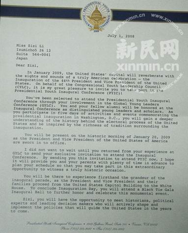 新民網29日致電該女生所在的成都市實驗外國語學校,分管德育工作的副校長李俊說,該校高一女生李紫子獲邀參加奧巴馬就職典禮確有其事,但發出邀請函的單位并不是美國國會,而是國會下屬的一個名為“全球青少年領袖論壇”(the Congressional Youth Leadership Council)的青少年組織。去年8月,李紫子因參加了該組織舉辦的比賽并表現出色,因此才會收到邀請函。