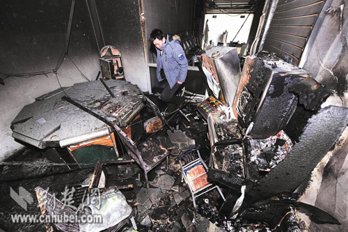 該學(xué)生公寓位于武漢經(jīng)濟(jì)技術(shù)開發(fā)區(qū)碧湖新村。昨日上午9時(shí),記者在該公寓42棟宿舍看到,該棟宿舍共有6層,其中1樓為臨街門面。失火的游戲機(jī)室位于3單元201宿舍樓下,面積約50平方米,里面有10多臺(tái)游戲機(jī),均被燒毀(如圖)。