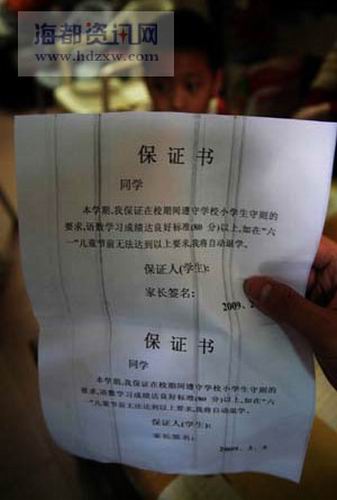 對于他兒子的說法,王先生予以證實。他說,已有學生家長交上簽好名的保證書,當時校方叫他簽字時,他婉拒了。“孩子受教育應該是平等的,不應以學習成績來區別,這兩天孩子一直悶悶不樂,可能此事已傷到他的自尊心了。”王先生說。