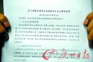 記者調(diào)查了解到,佛山職業(yè)技術(shù)學院是佛山的一所大專院校,共有十幾個專業(yè),三年制,全校共有3000多名學生。從2007年年底,該學院的學生會要求全校學生交納學生會會費,開始時是每年交一次,一次交20 元,后來改成一次性交齊60元。三個年級三年下來收費將達18萬元。