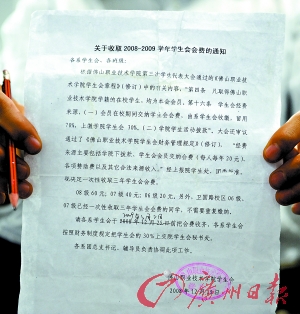記者從該學校學生會2008年12月15日下發(fā)的一份蓋有公章的《關(guān)于收取2008~2009學年學生會會費的通知》上看到,收取會費的根據(jù)是佛山職業(yè)技術(shù)學院第三次學生代表大會通過的《佛山職業(yè)技術(shù)學院學生會章程》(修改)中的有關(guān)內(nèi)容,“凡取得佛山職業(yè)技術(shù)學院學籍的在校學生,均為本會會員”、“學生會經(jīng)費來源,會員在校期間交納學生會會費(每人每年20 元),由系學生會收繳,留用70%,上繳學院學生會30%。”