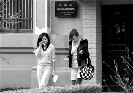 昨天下午4點46分,王亭亭站在北外的校門口,身邊跟隨著一位衣著時尚、戴著墨鏡的女士。幾個北外的學生當即認出了她,王亭亭身穿的粉色套裝和博客上的照片一模一樣,照片中染色的卷發(fā)已經(jīng)拉直并且染成黑色,表情有些冷漠,并不顧及旁人的目光,低頭直接走進離北外校門不足200米的德語系辦公樓。