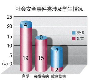 自殺 2008年高校共發生社會安全類事件45起(見圖二),涉及學生47人,造成36人死亡,11人受傷。其中居首位的是自殺事件,共23起,造成 19人死亡,4人未遂;15名大學生因突發疾病死亡,主要由于心臟、哮喘等疾病所致;校內外故意傷害事件7起,造成2名學生死亡7人受傷,其中5起為三人以上的斗毆事件。