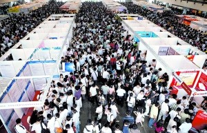 據(jù)介紹,此次共吸引了600多家用人單位參展,提供了5000余個(gè)職位,主要涉及工程技術(shù)、電子、銷售、人力資源以及制造業(yè)等。其中,不乏中國人壽、百盛、北大青鳥、聯(lián)想、百度、大中等知名企業(yè)。在舉行招聘會(huì)的國展2、3、4號(hào)館里,應(yīng)聘者人頭攢動(dòng),水泄不通,主辦方為了保證三個(gè)展館內(nèi)的正常運(yùn)行還進(jìn)行了暫時(shí)的人流控制和疏導(dǎo)。截至昨天11時(shí),招聘會(huì)已吸引了近2萬名求職者。