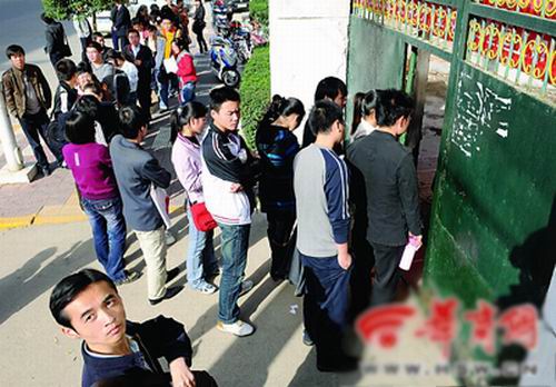 人才交流中心外領應聘表的人排著長隊 記者 鄧小衛 攝