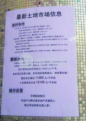 有意思的是,開發(fā)商臨時(shí)貼出了一張“最新土地市場(chǎng)信息”的公告,先說了土地拍賣的“激烈爭(zhēng)搶”和“震撼對(duì)比”兩部分內(nèi)容后,給出了“樓市前景”——“盡管新政頻出,但地產(chǎn)大鱷對(duì)南京地產(chǎn)充滿信心,勢(shì)必帶動(dòng)房?jī)r(jià)迅速上漲!”一些購房人看到后忿忿不平:這不是明擺著和政府的調(diào)控政策“叫板”嗎?開發(fā)商也太牛了吧!
