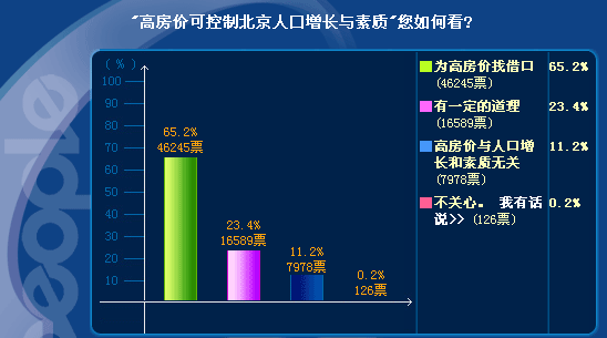截止到14日晚21時,參與調(diào)查的網(wǎng)民共計70938人,其中有46245人認為這是在為高房價找借口,直接質(zhì)疑任志強的“素質(zhì)”,持此一觀點的網(wǎng)民占總?cè)藬?shù)的比例高達65.2%。此外另有11.2%的人也明確表示房價與人口增長和素質(zhì)無關。不過,也有近四分之一的網(wǎng)民認為任志強的說法"有一定道理"。