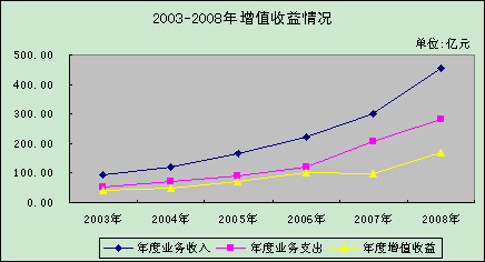 2008年業(yè)務收入為453.56億元,同比增加152.67億元,增幅為50.74%。業(yè)務支出為283.46億元,同比增加78.48億元,增幅為38.29%。增值收益為170.10億元,同比增加70.49億元,增幅為70.77%。年末貸款風險準備金余額為285.67億元,占貸款余額的4.68%;年末城市廉租住房建設補充資金總額為191.93億元,按規(guī)定累計向同級財政上繳96.98億元。