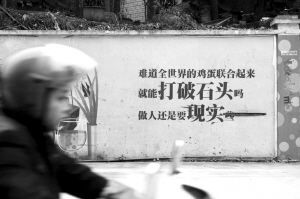 日前,讀者吳先生打進(jìn)本報(bào)熱線稱,他在南岸一新建小區(qū)外看到了這樣一條標(biāo)語(yǔ),讓他很費(fèi)解,他不知道開(kāi)發(fā)商打出這條廣告宣傳語(yǔ)是什么意思?吳先生說(shuō),這句宣傳語(yǔ)這樣寫(xiě)道:“難道全世界的雞蛋聯(lián)合起來(lái),就能打破石頭嗎?做人還是要現(xiàn)實(shí)些。”