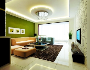 在本設計案例中,設計師利用戶型本身具有的寬闊視野,協調整體布局,將現代簡約風格之美體現得淋漓盡致。整體設計以淺色、暖色調為主,地毯和木質門溫暖的材質融合了茶幾黑色冷峻的色調,在空間上達到冷暖的和諧,搭配松軟、舒適的沙發給居室營造出溫馨、輕松的感覺。墻面的設計是此作品的亮點,電視背景墻的線條自然,圖案打破整個格局內的單一性。而對面的墻壁采用了柔軟的蘋果綠色,通過簡單的幾幅畫框來點綴出雅致的居家氛圍。