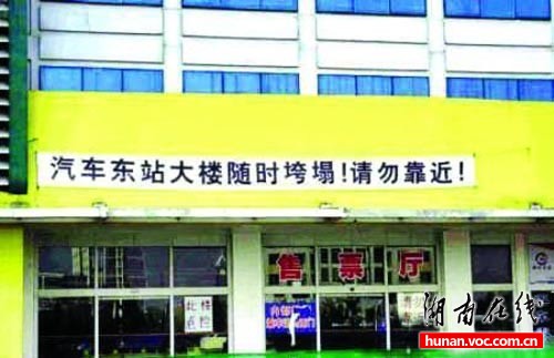 該工作人員表示,車站邀請專家對大樓進行鑒定指出,此樓隨時會垮塌,有可能發生脆性斷裂,人員在里面非常危險,所有的辦公單位已經搬出。“打出橫幅是為了提醒廣大市民‘此樓危險’。”