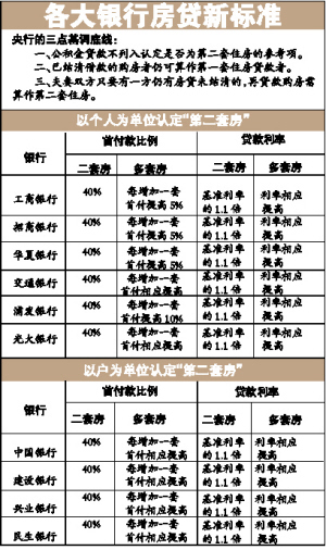 認(rèn)定第二套住房,關(guān)鍵是看計(jì)算單位是家庭還是個(gè)人。在這方面,四大銀行和其他商業(yè)銀行及分支機(jī)構(gòu)已經(jīng)出現(xiàn)分歧。央行正聯(lián)合四大商業(yè)銀行討論房貸“第二套房”的核定標(biāo)準(zhǔn),預(yù)計(jì)近日將確立統(tǒng)一的“第二套房”認(rèn)定標(biāo)準(zhǔn)。中國(guó)建設(shè)銀行已經(jīng)明確了“第二套房”的認(rèn)定標(biāo)準(zhǔn)是以“戶”為單位。不出意外的話,這也將是其他三大商業(yè)銀行的選擇。目前華夏、光大等銀行則以個(gè)人為單位界定第二套房。