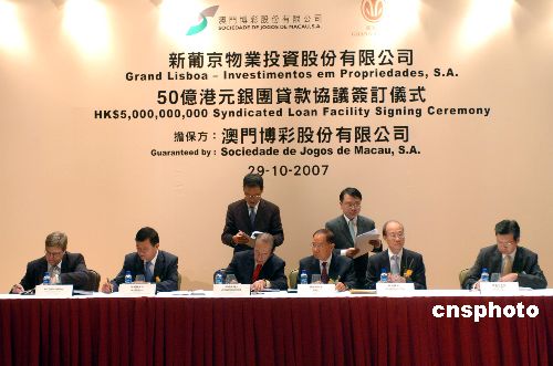 十月二十九日,新葡京物業投資股份有限公司在澳門新葡京成功,簽訂五十億港元銀團貸款協議。是項貸款由誠興銀行、中國工商銀行澳門分行以及法國巴黎銀行香港分行牽頭協調,中國農業銀行香港分行等十家銀行參與。是項銀團貸款分五年期,由澳門博彩股份有限公司擔保,貸款將用于新葡京項目。澳門博彩股份有限公司行政總裁何鴻燊博士出席簽字儀式。中新社發 史利 攝