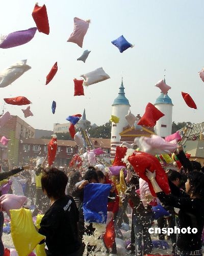 為慶祝即將到來的“三八”國際婦女節,風靡歐美的游戲“枕頭大戰”3月3日在長沙世界之窗再次擂響戰鼓,千余名女性以枕頭當“武器”,互相投擲,發泄壓力。中新社發 肖前輝 攝