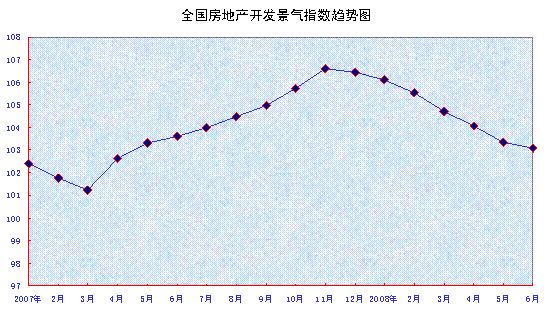 中新網7月18日電 據國家統計局網站消息,6月份,“國房景氣指數”為103.08,比5月份回落0.26點,比去年同月回落0.55點。