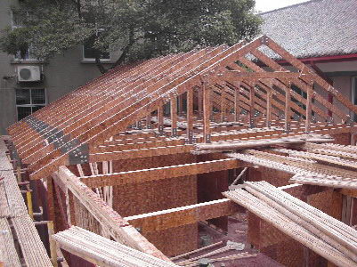據介紹,竹結構住宅所用的結構構件和連接件都是采用工廠標準化生產,蓋房子就像搭積木一樣。施工過程類似于北美的平臺式輕型木結構住宅施工,其樓蓋和墻體分開建造,因此已建成的底層樓蓋可以作為上部墻體施工時的工作平臺。通常墻體骨架可在工作平臺上拼裝,然后人工抬起就位。墻體也可在其他地方先拼裝好,再運到施工現場就位。
