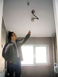 昨天,記者來到新怡家園6號樓10層李先生的新居。李先生說,這幢樓最高為11層,自己家的樓上是一間躍層,而自己家是平層,層高為2.8米。可是等到驗收新房時,他們竟然發(fā)現(xiàn)位于北側(cè)的廚房和臥室的屋頂變成了斜斜的坡頂。記者看到,南側(cè)的房屋屋頂都為平的,只是到了廚房和北側(cè)的臥室屋頂突然變成坡頂。而本來就不大的廚房因為傾斜的坡頂顯得更加狹小,靠近窗子處的屋頂距地面的距離僅有1.7米左右,伸手即可觸摸到屋頂。“他們這樣做就是變更了設計。”