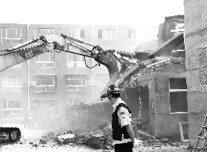 最后,在確定房間內(nèi)無人無物的情況下,機械設(shè)備將五排連體二層住宅小樓中的一棟全部拆除、四棟部分拆除。直到中午十一點,執(zhí)行工作基本完畢。