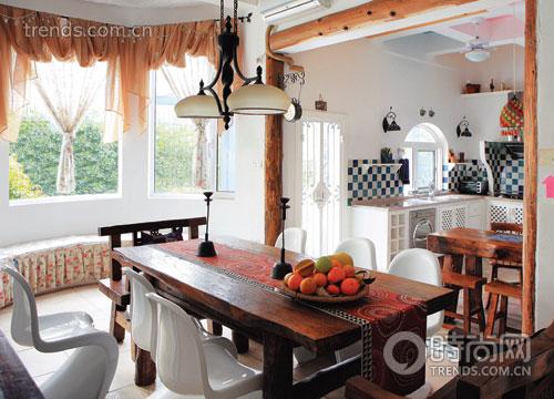 玄關是室內的第一視覺焦點,小米用藍白兩色為這個家點了題,與房子的外立面呼應:白色的墻面,藍色的門板、鞋柜、天鵝頭木盆描繪著浪漫的地中海風情;客廳里條紋圖案的布藝沙發和花朵圖案的布藝貴妃椅則是典型的鄉村風格,主題墻上點題式地掛起兩幅與海岸相關的油畫;餐廳里,小米玩起了混搭——上等老榆木的厚重餐桌,兩頭各放一張老榆木餐椅,氣勢穩重,兩側則是四張設計感很強的白色Panton椅,起初你會覺得有點大膽,再認真審視,又覺得這種碰撞很和諧,小米說:“我喜歡來點驚喜的感覺,這椅子的線條很優美,像海浪般起伏,與老榆木的感覺一個新,一個舊,一個輕,一個重,相映成趣。”