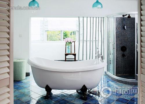 細節是小米比較關注的。主浴室兼顧了清潔與休閑兩個功能,地面是湛藍湛藍的光面磚,白色的墻身,延續著地中海的藍與白,“因為浴室最重要的功能是放松,所以選擇的色系盡量簡單純凈,用刷白了的竹子作為大空間的隔斷,主要是做視覺上的劃分,分隔出清潔區與休閑區:清潔區就是浴缸及洗手盆那一區,主要突出功能的一面;我將陽臺打通,做出一個女性都會喜歡的陽光花房作為休閑空間,雅致的淡綠色布簾幔與窗外的綠意相合。浴室就是身心放松的空間,是我設計里比較注重的地方。”