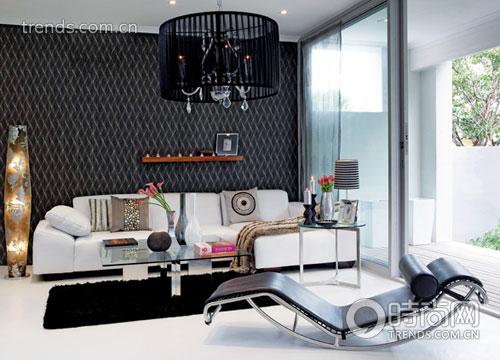 墻壁大面積使用黑底白紋的圖案,給地板留出足夠簡潔的空間。沙發上方做出的原木架將發散的目光重新聚集,照片擺在一側,圓扁的小蠟燭悄悄亮起,讓氣氛一下活躍起來。水晶吊燈線條優美,外面籠罩了一層黑色豎紋裝飾,與沙發前純黑的地毯遙遙相望,而躺椅完美的弧度在提供給主人充足的休息之余,也配合著前兩者成為屋內最為深暗的色彩之一。橫排的白色沙發顯露出十足的貴族氣息,高高豎在一側的地燈也相應地做出漂亮的大花圖案,亮燈時花朵若隱若現,朦朧之美呼之欲出。