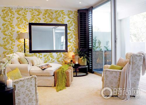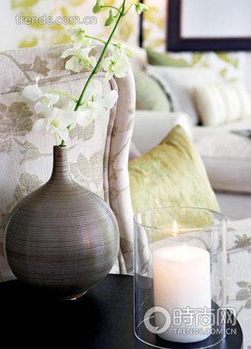 布藝沙發(fā)也同樣遵循了花色與純色混搭的原則,奶白色的雙人沙發(fā)用淺灰綠的靠包來點(diǎn)綴,分坐兩旁的單人沙發(fā)則使用枝葉與花朵的暗紋來處理,旁邊配上深色的小茶幾,精致的圓肚細(xì)頸花瓶里悄悄探出一枝素雅的白色蝴蝶蘭,跟玻璃罩內(nèi)點(diǎn)燃的白色蠟燭相映成趣。