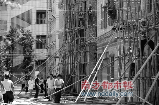昨日記者在現場了解到,橫崗街道執法隊將拆除這些違建的腳手架和升降機等工具。