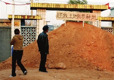 認(rèn)為村委會(huì)未按照占地時(shí)的承諾為其置換土地,14日晚,村民靳先生雇車運(yùn)來(lái)黃土,堵住豐臺(tái)區(qū)長(zhǎng)辛店鎮(zhèn)大灰廠村村委會(huì)的大門。