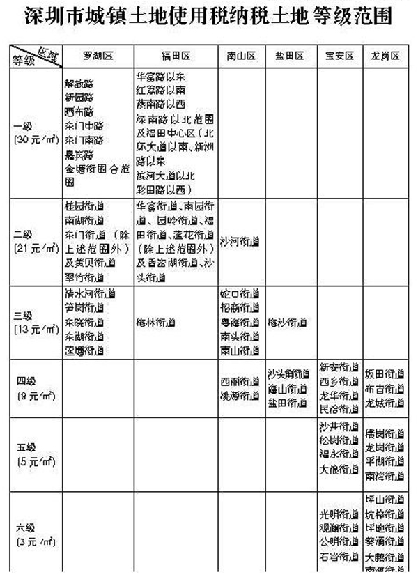 記者了解到,羅湖和福田區(qū)適用的稅額最高,均為三級(jí)以上土地。其中羅湖區(qū)的東門中路、解放路,福田中心區(qū)等地域都屬一級(jí)土地,每平方米年稅額達(dá)30元,而羅湖區(qū)的蓮塘街道和福田區(qū)的梅林街道等地域?qū)儆谌?jí)用地。另一方面,寶安和龍崗區(qū)適用稅額最低,均為四級(jí)以下土地;南山區(qū)和鹽田區(qū)則適用二到四級(jí)土地稅額。