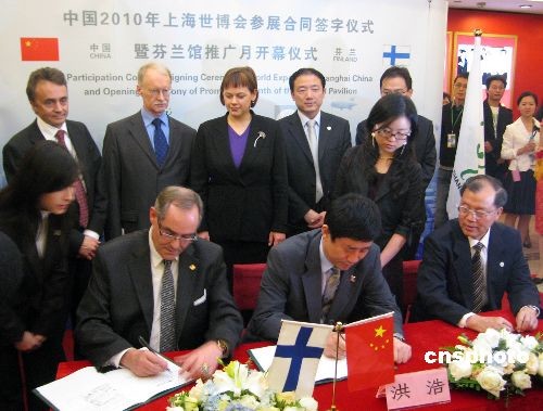 11月5日,芬蘭政府正式簽約參展中國2010年上海世博會,上海世博會芬蘭政府總代表胡毅督(左)與上海世博局局長洪浩在上海簽署參展合同。據介紹,芬蘭政府計劃投入約1400萬歐元,在上海地標盧浦大橋畔的世博園區建造占地3000平方米的芬蘭國家館,該館定名為“冰壺”。為期一個月的“上海世博會芬蘭推廣月”也自5日起在上海拉開帷幕。中新社發 許曉青 攝