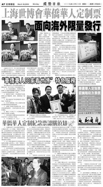 中新網4月8日電 《國際日報》3月30日刊登世博專版,介紹上海世博會華僑華人定制紀念票。